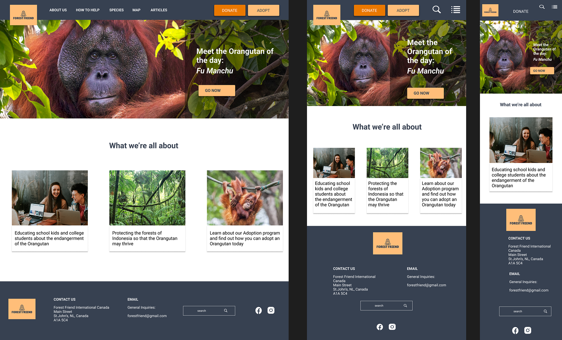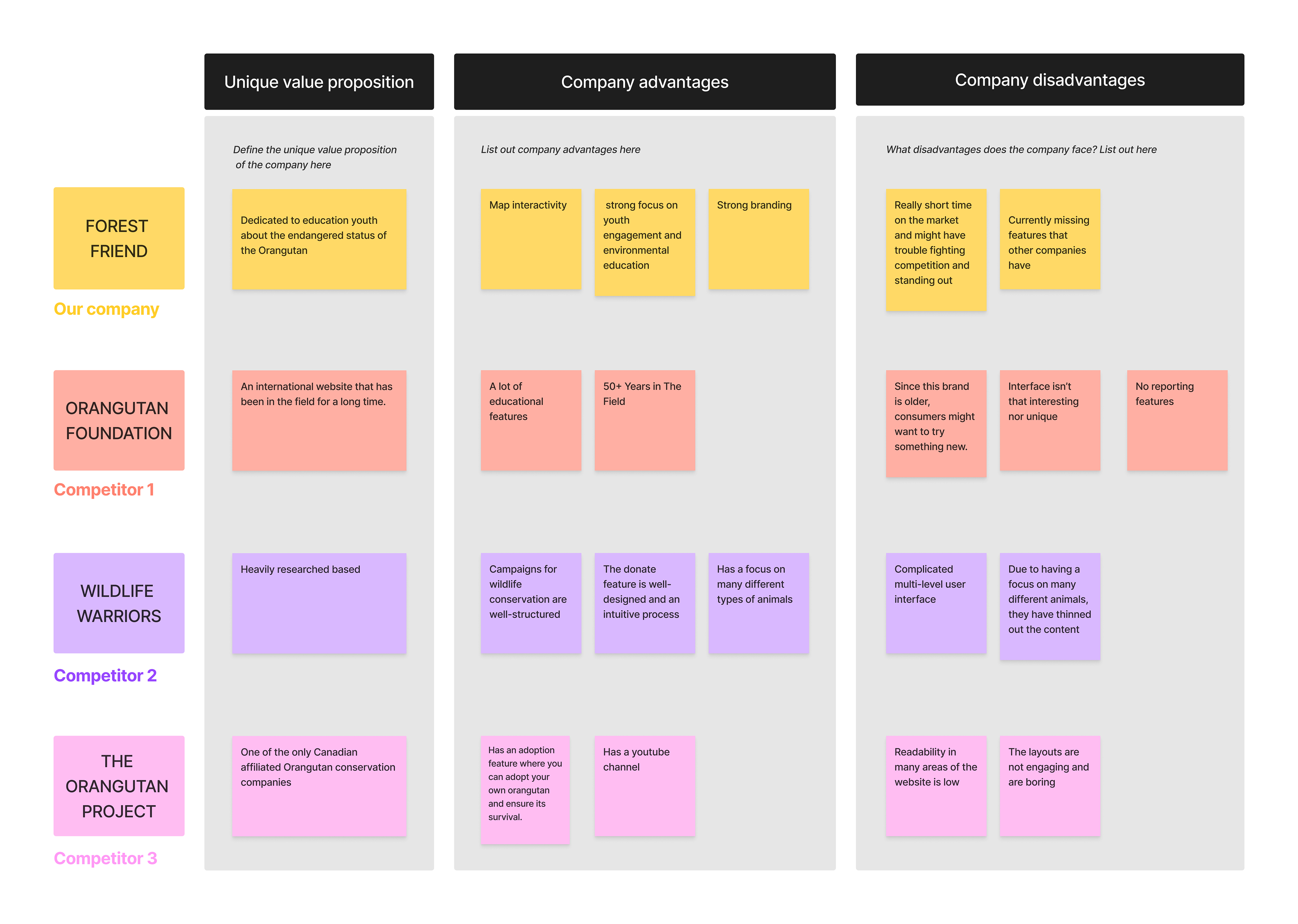 A major criteria for the research phase was to analyze all the competitors of the proposed application I wanted to build. Part of that was to see what kinds of websites and applications were already out there in regards to both nature conservation and, specifically, organgutan conservation. Through my research, I found many competitors but narrowed the list down to three main ones. My chart below analyzes them concisely and in doing so I attempted to show where there are gaps that I can fill with my own application.